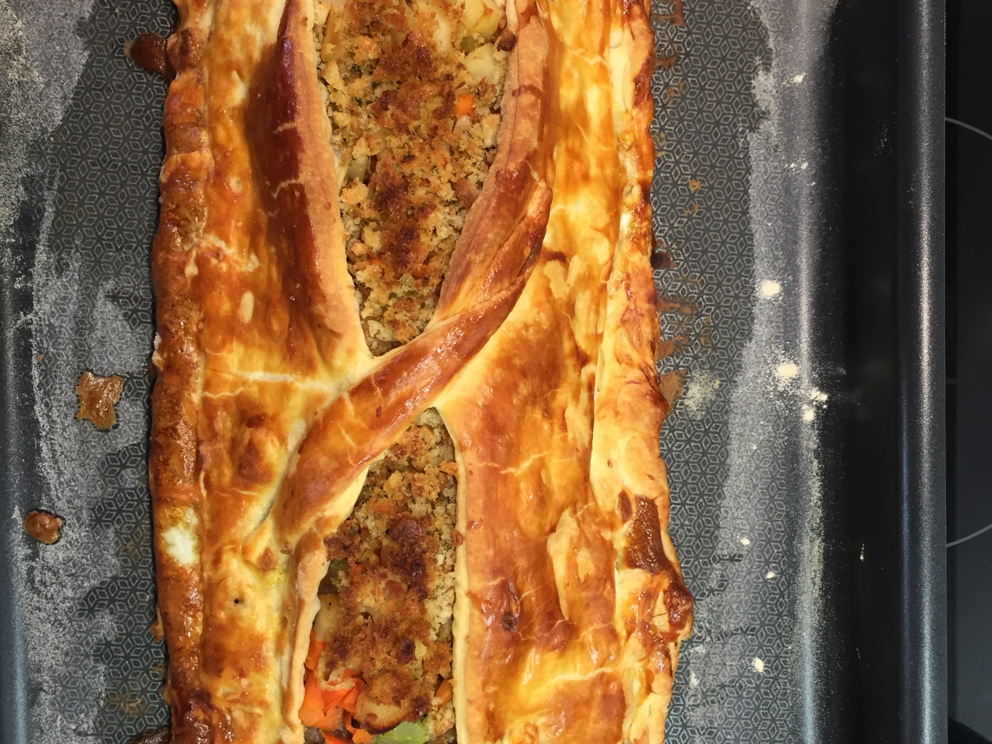 The principle is basically to get a meat & veg combination which is neither too wet nor too dry – think sausage roll. So just chopped turkey would probably be too dry, too much mashed veg too wet. Chose a layer of sauce for the base that matches your primary meat – cranberry or red currant goes with most traditional Christmas fayre.