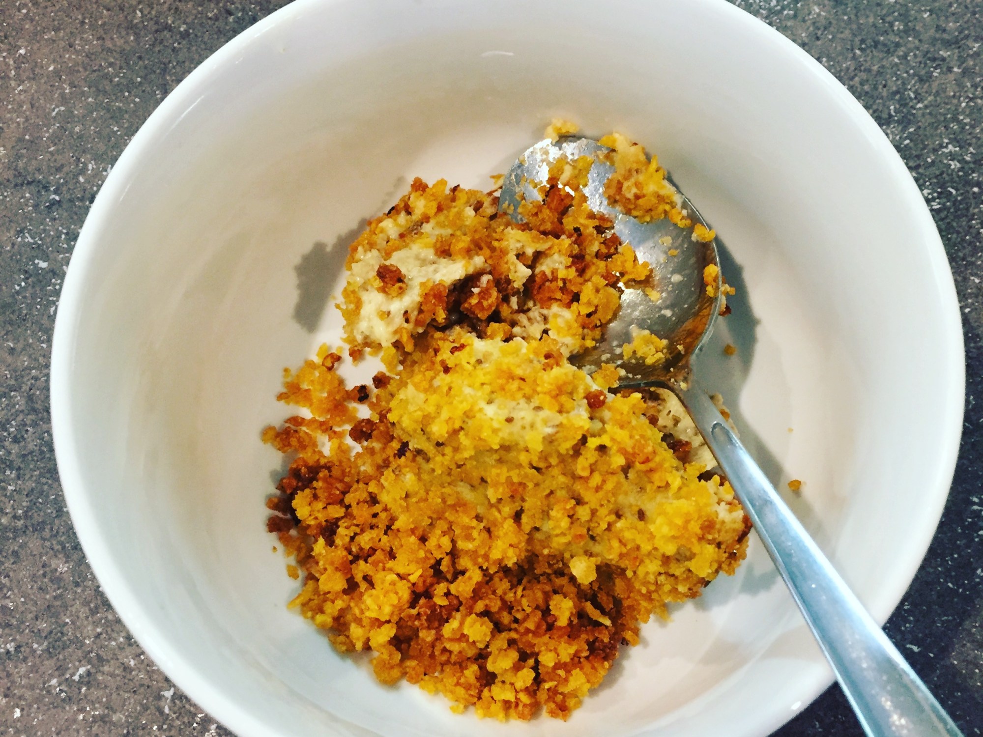 The basic theme was a bread-pudding style (made with the Disney cereal & soya yoghurt – more on this later), layered over a ‘pastry’ base (provided by a stale croissant) with a sweet crunchy topping. Even with the brazen added-sugar, a portion of this comes in at around 270 calories. Better than many alternative desserts. The citrus flavours make it a more summery alternative to crumble. Serve it cold, with a little vanilla ice cream if you aren’t already bouncing off the walls at the thought of it.