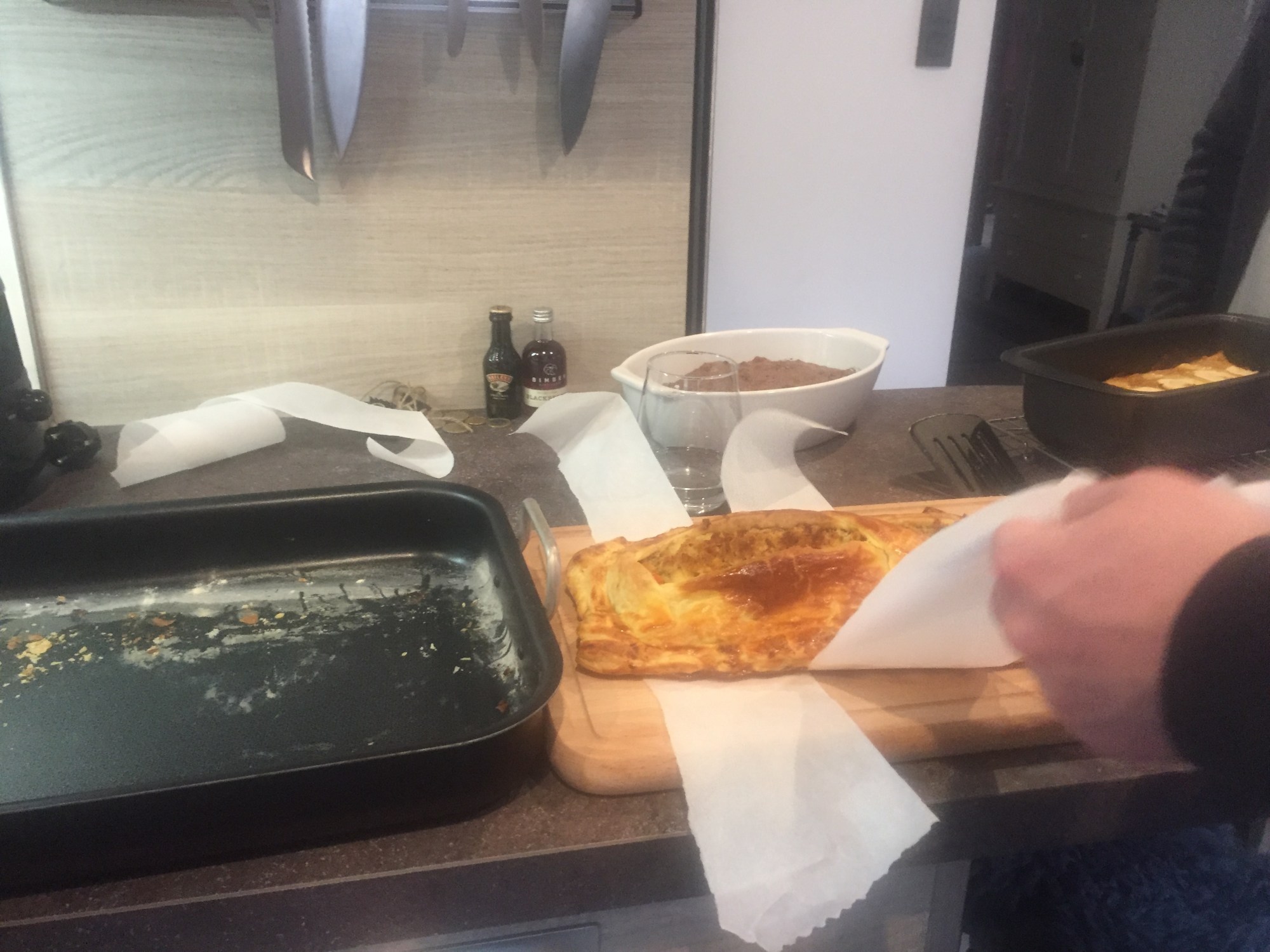 Use this trick to remove any large pie, tart or sausage roll type dish from a baking tray with sides. It’s a bit like the way rescuers pick up a beached whale. Alright, only a bit.